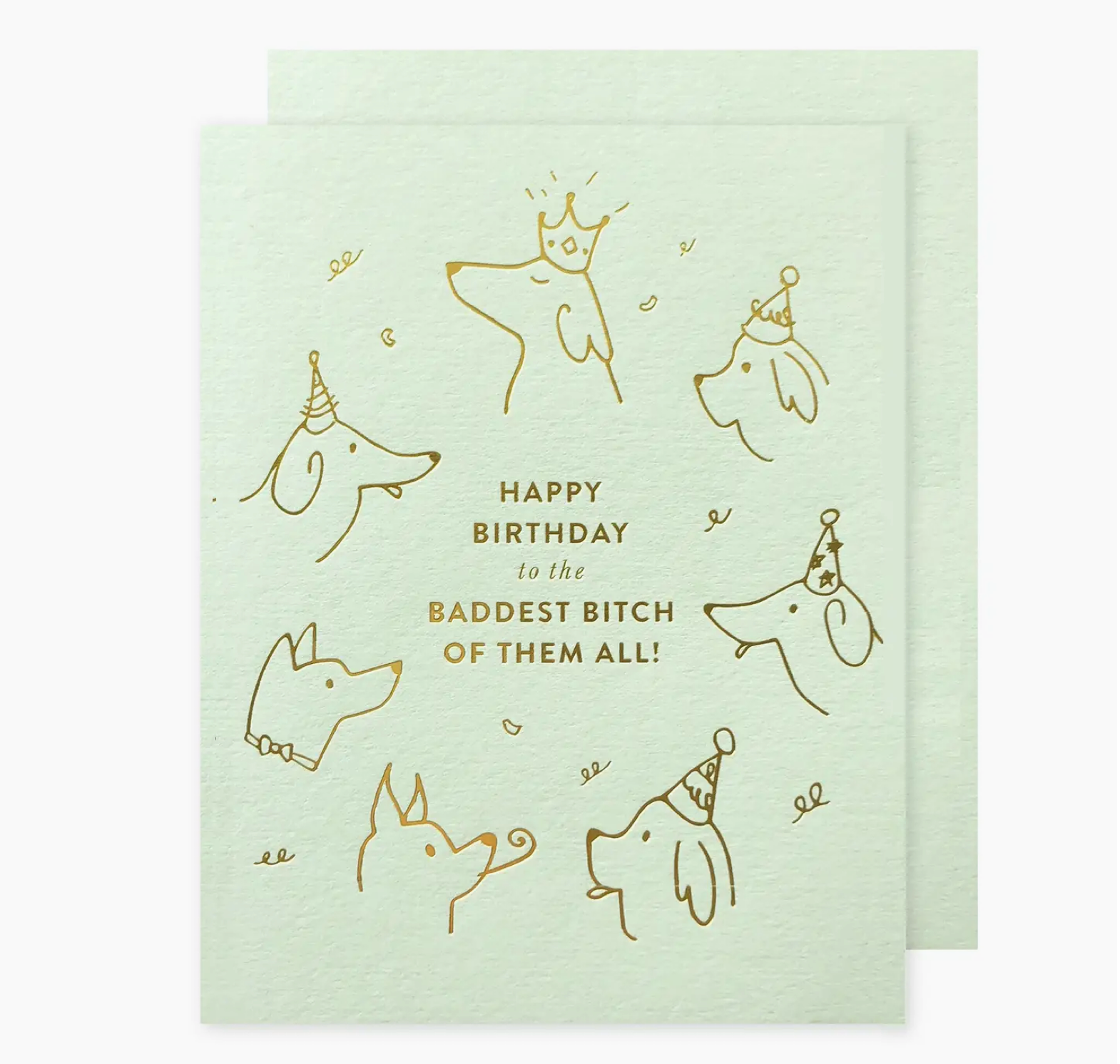 Greeting: "Happy Birthday to the Baddest Bitch Of Them All" (Blank Inside) Printing: Gold Foil Card size: 5.5" x 4.25", Folded Paper: thick colored stock with coordinating A2 envelope