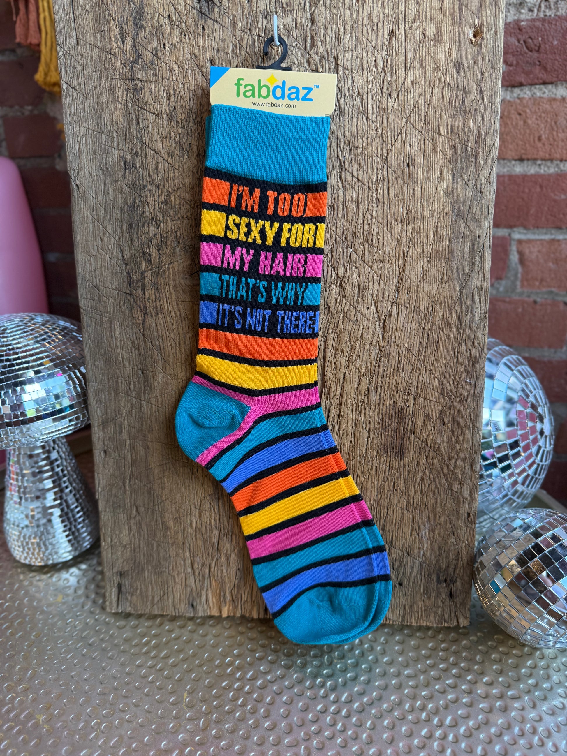 Funny men's novelty crew socks "I'm Too Sexy For My Hair That's Why It's Not There." Stylish and comfortable! Fits men's shoe size 7 to 12.