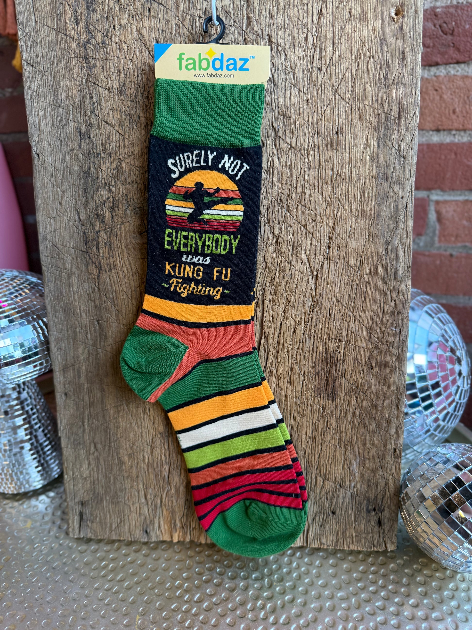 Men's novelty crew socks with saying "Surely Not Everybody Was Kung Fu Fighting" Stylish and comfortable! Fits men's shoe size 7 to 12.